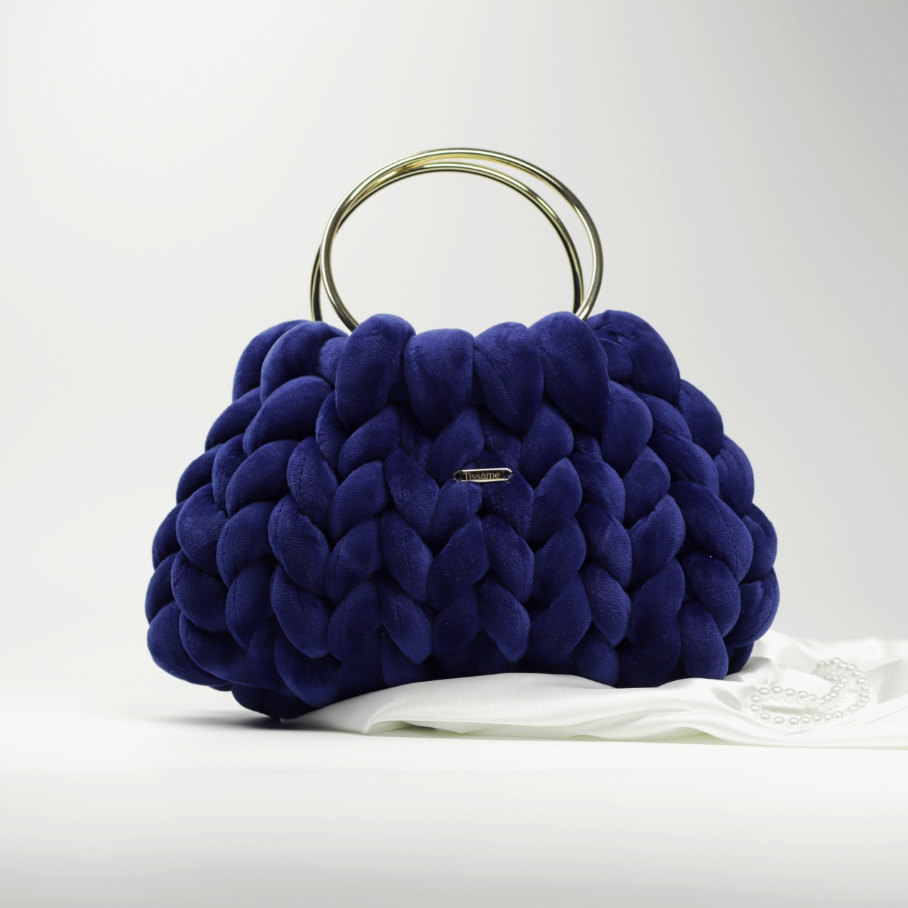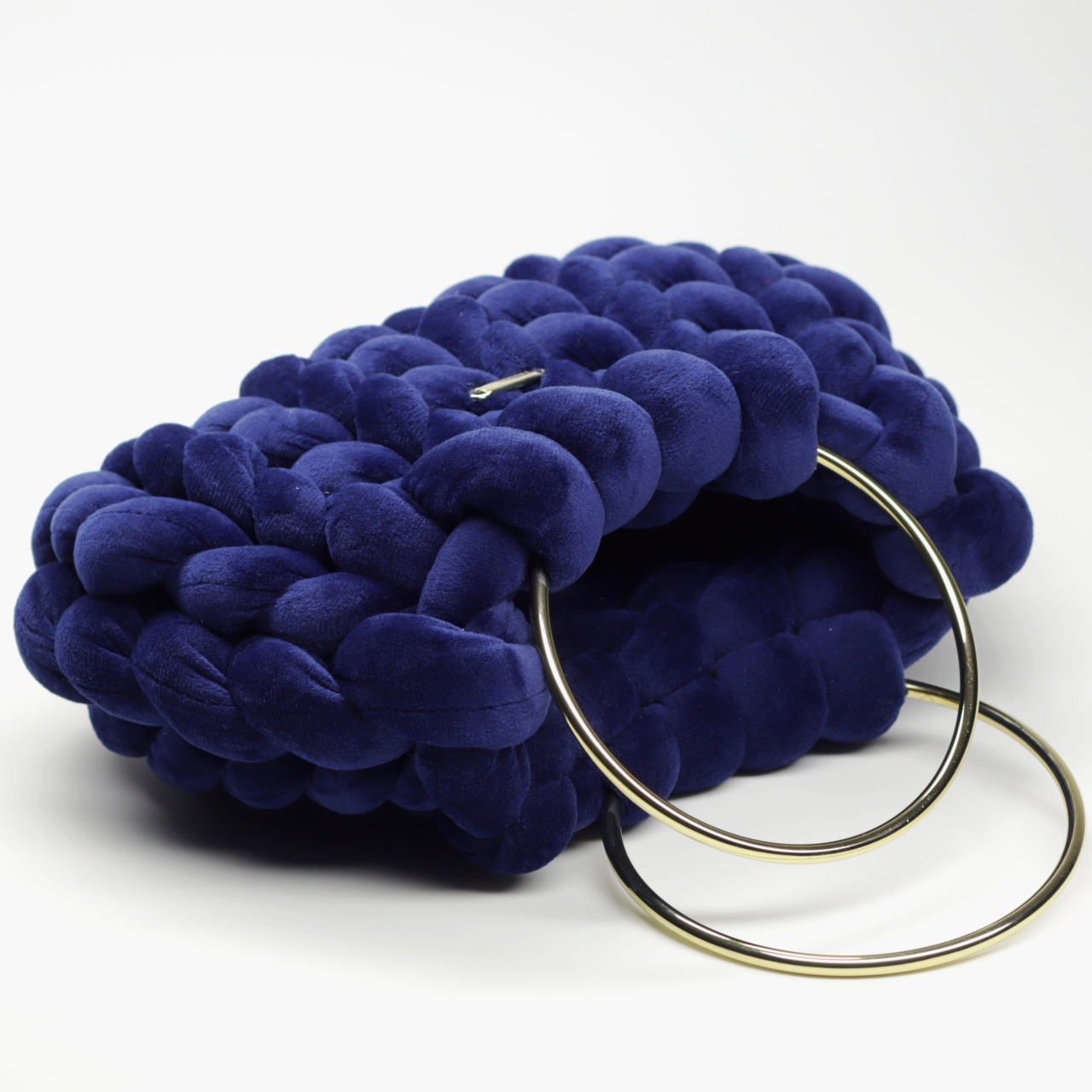 Ciemny granat, który przypomina głęboką toń oceanu. To torebka dla kobiet, które cenią klasykę, ale szukają głębi. Ręcznie pleciony welur jest miękki i zmysłowy, a złote uchwyty wprowadzają luksusową nutę, idealną na formalne i uroczyste spotkania.