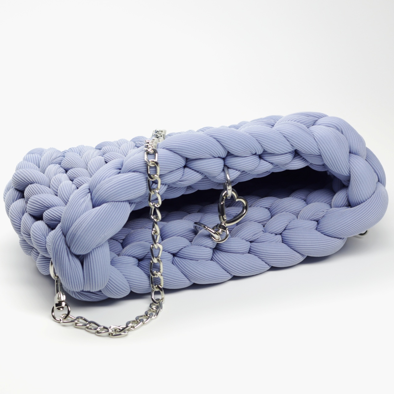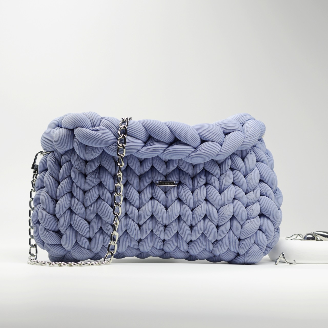 Chłodny błękit przełamany stalowymi tonami idealnie współgra ze srebrnymi dodatkami. Ta torebka z grubej włóczki to idealny balans między wygodą, a stylem. To model, który odnajdzie się w biurowym dress code oraz podczas weekendowych spotkań w galerii sztuki.